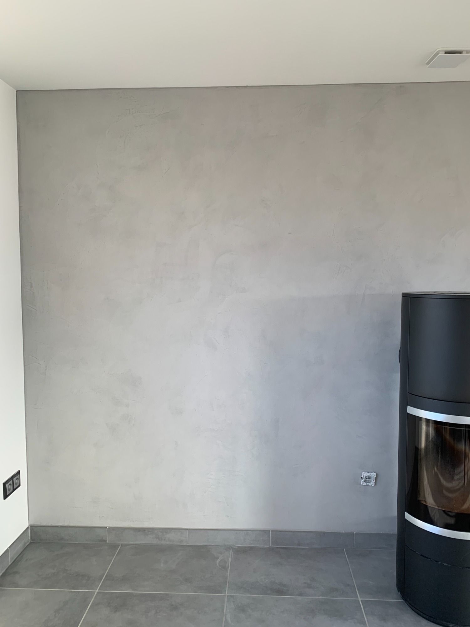 Réalisation d'un mur en béton ciré pour un aspect chaleureux allié au poêle à bois.