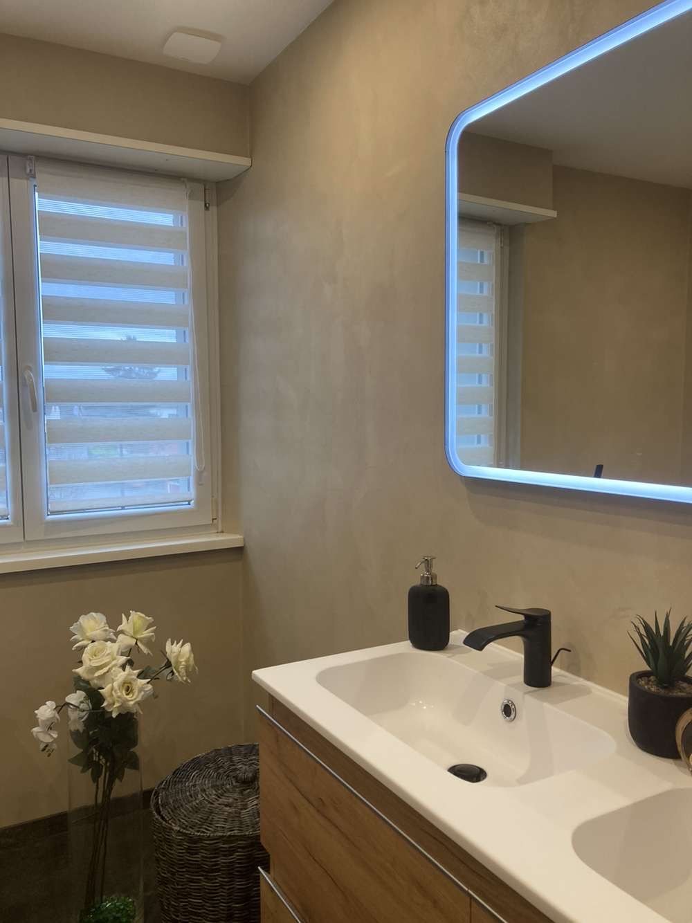 Réalisation d'une salle de bain béton ciré en recouvrement d'un ancien carrelage.